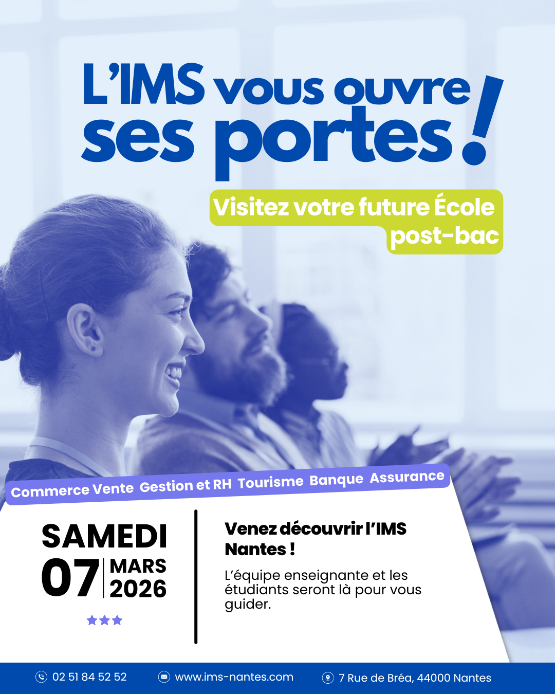 L’occasion de visiter les locaux, rencontrer des étudiants de L’IMS et poser vos questions sur les différentes formations ! Vous pourrez également rencontrer l’équipe enseignante, échanger sur les parcours proposés et obtenir toutes les informations nécessaires pour construire votre projet d’études.